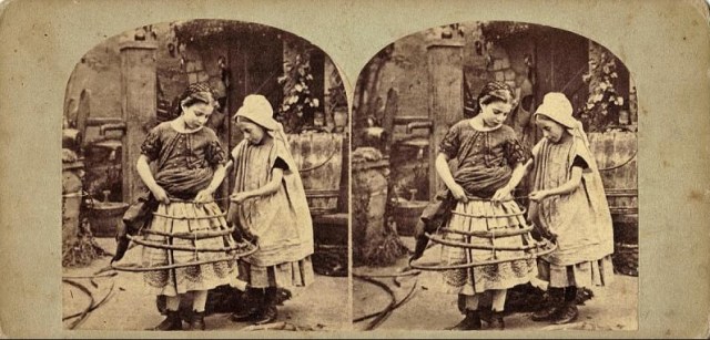 There’s a sorry history of cultural appropriations of the crinoline, often for purposes other than high fashion, usually with the intent of debunking or perverting the gloire of the crinoline’s architecture. This awkward specimen, widely reproduced, sometimes goes by the title of ‘The Bachelor’s Dream’, an albumen print from around 1860, and not, as they […]